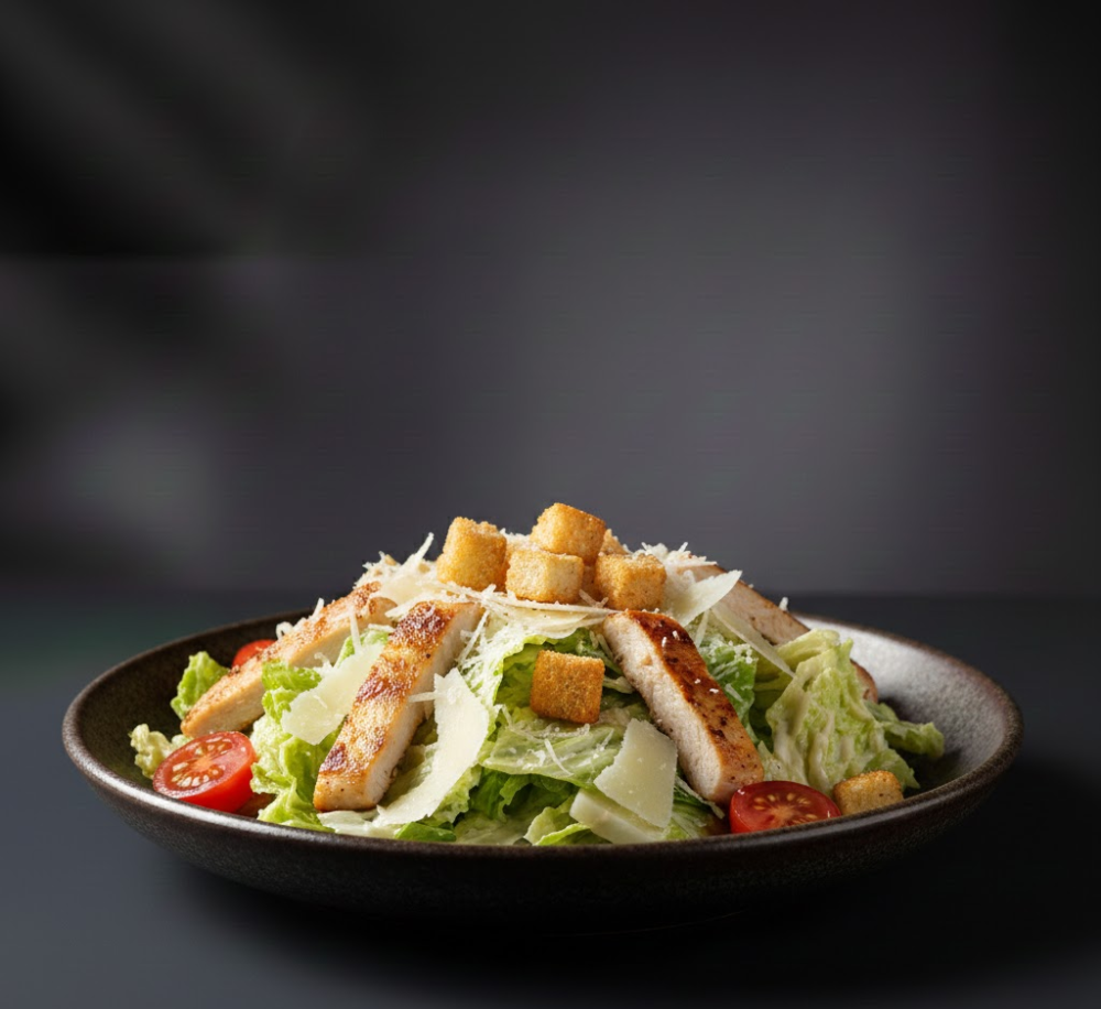Пекинская капуста, креветки, соус цезарь, пармезан, сухарики.