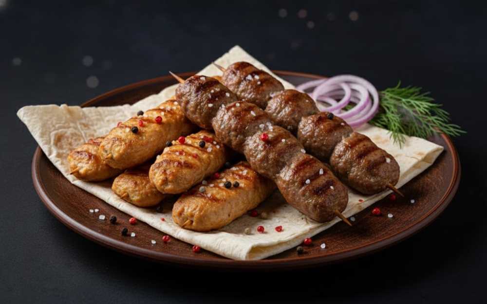 Традиционное восточное блюдо из рубленого мяса (курица или свинина на ваш выбор) со свежими травами и специями, приготовленное на шампурах.