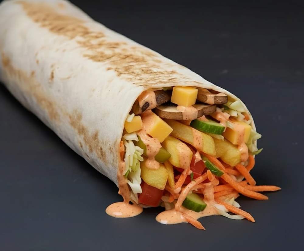 Пекинская капуста, шампиньоны, чеддер, томат, огурец, фри, солёный огурец, морковь по-корейский, соус фирменный.
