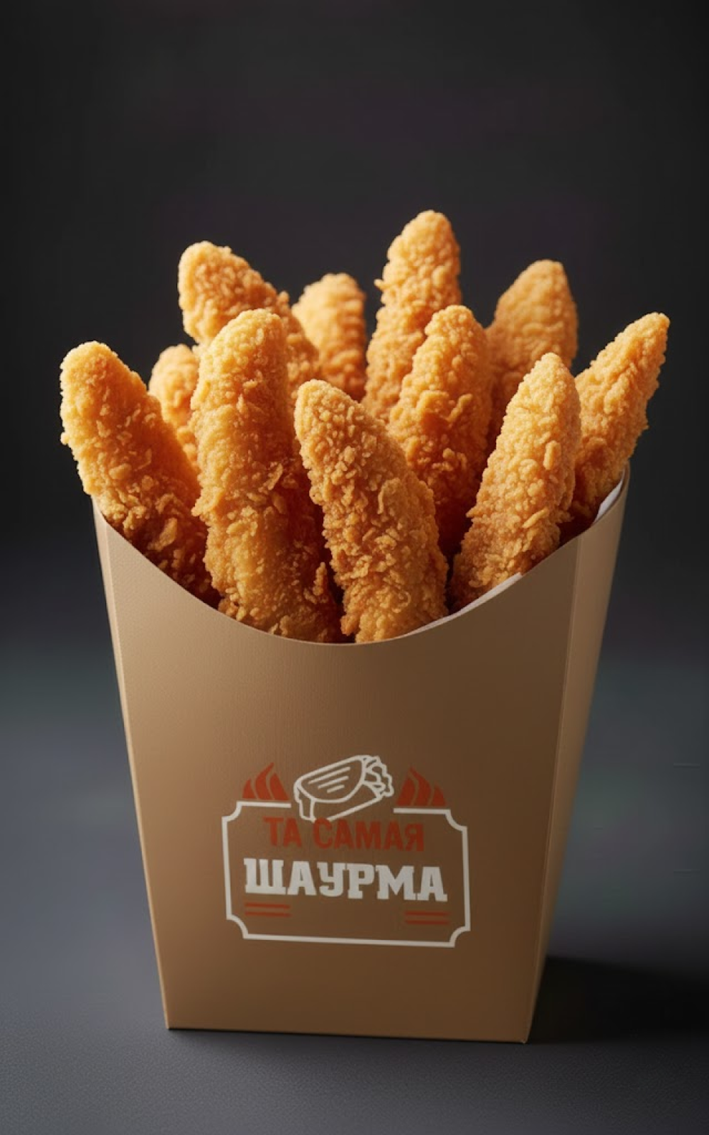 Нежное филе куриной грудки, нарезанное на продолговатые кусочки и обваленное в хрустящей золотистой панировке.